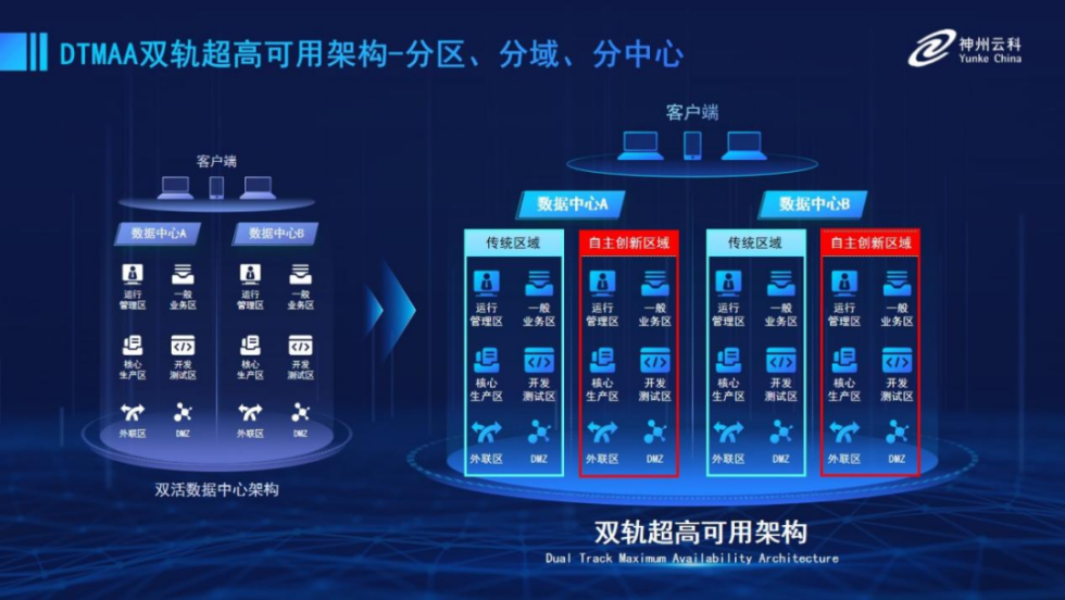 为帮助金融客户更好地应对数字经济时代对可持续性的高要求,实现“信创”与“数字化”齐头并进,瓦力游戏官网推出了双轨超高可用架构。该架构在双活数据中心的分区调度基础上,增加信创域和非信创域的分域调度,实行信创域与传统域应用全量部署,使双中心运营变为双中心四区域并行运行,互为多活,将“0到1”的单轨建设道路变为分区分域协同的多活双轨超高可用架构。帮助客户在新架构下,保障“信创”的同时解决性能瓶颈,提升稳定性,保证应用可持续性,最终实现信创区域和非信创区域的平滑过渡,完成国产化替代目标。